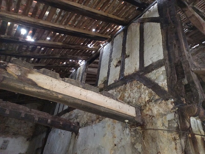 Cette maison, telle une poupée gigogne, a connu de nombreux agrandissements au fil du temps, vers l’avant, la gauche, la droite comme l’arrière. L’état du bâti visible ci-dessus témoigne de l’ancienneté de la construction. Elle fait actuellement l’objet d’une étude approfondie, et les poutres les plus anciennes ont été datées, par carbone 14, de la première moitié du XVe siècle.