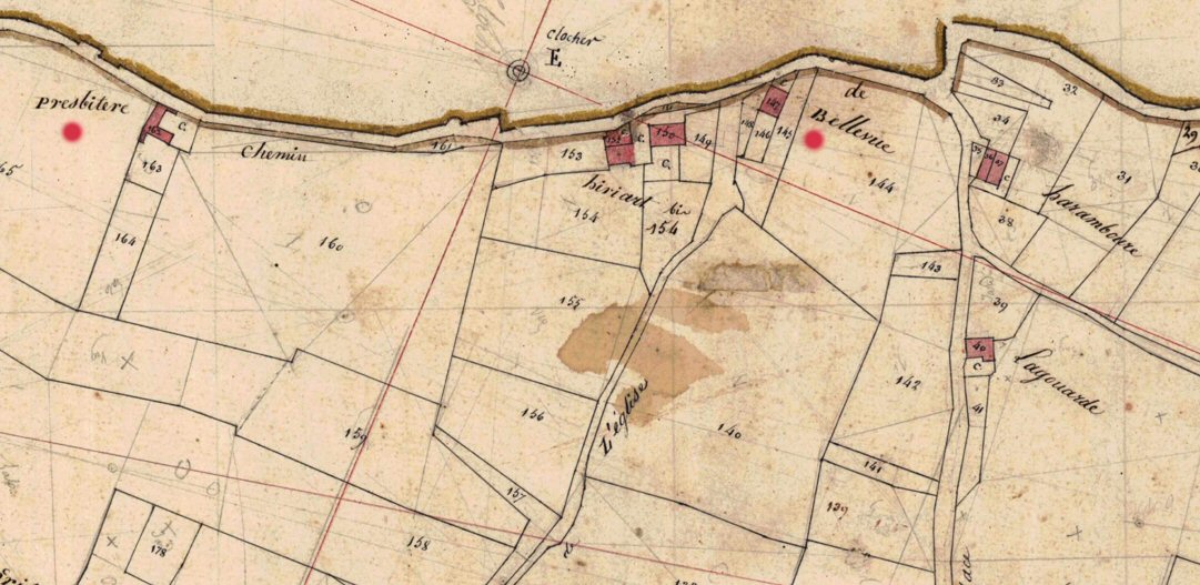 Sur le cadastre napoléonien de 1817 figure la maison Bellevue, bâtiment qui a connu plusieurs affectations au fil du temps : presbytère, école publique et aujourd’hui mairie.