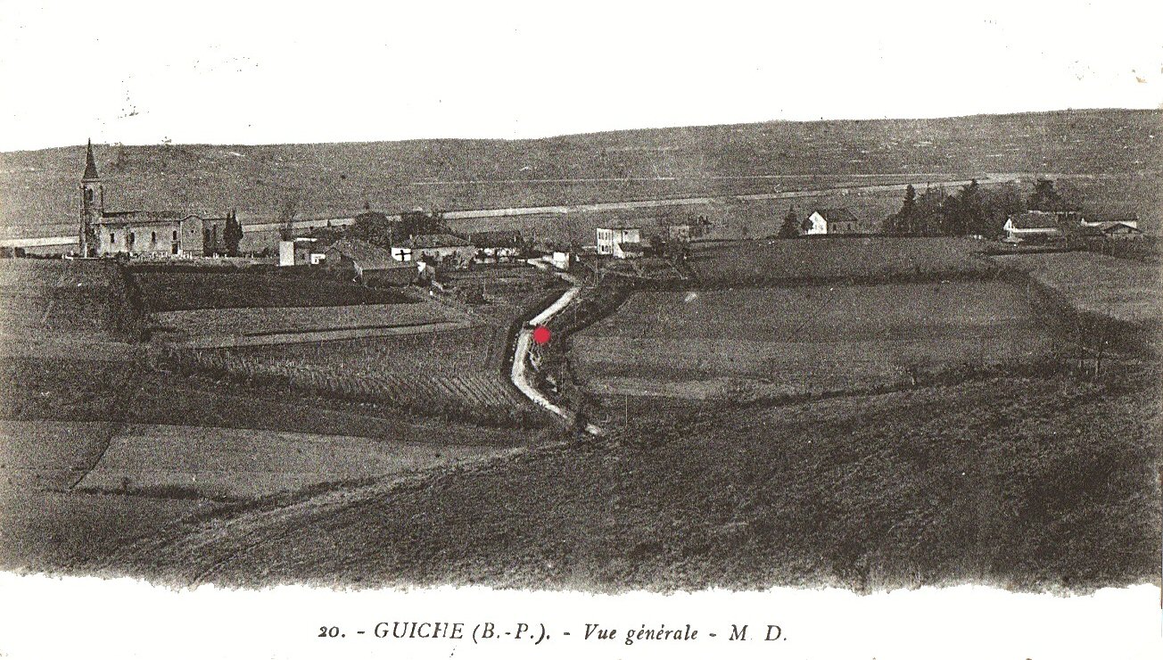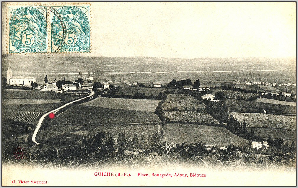 Cette carte postale du début du XXᵉ siècle offre une vue générale du village. Le point rouge indique l’emplacement de la fontaine et du lavoir de Hiriart.
