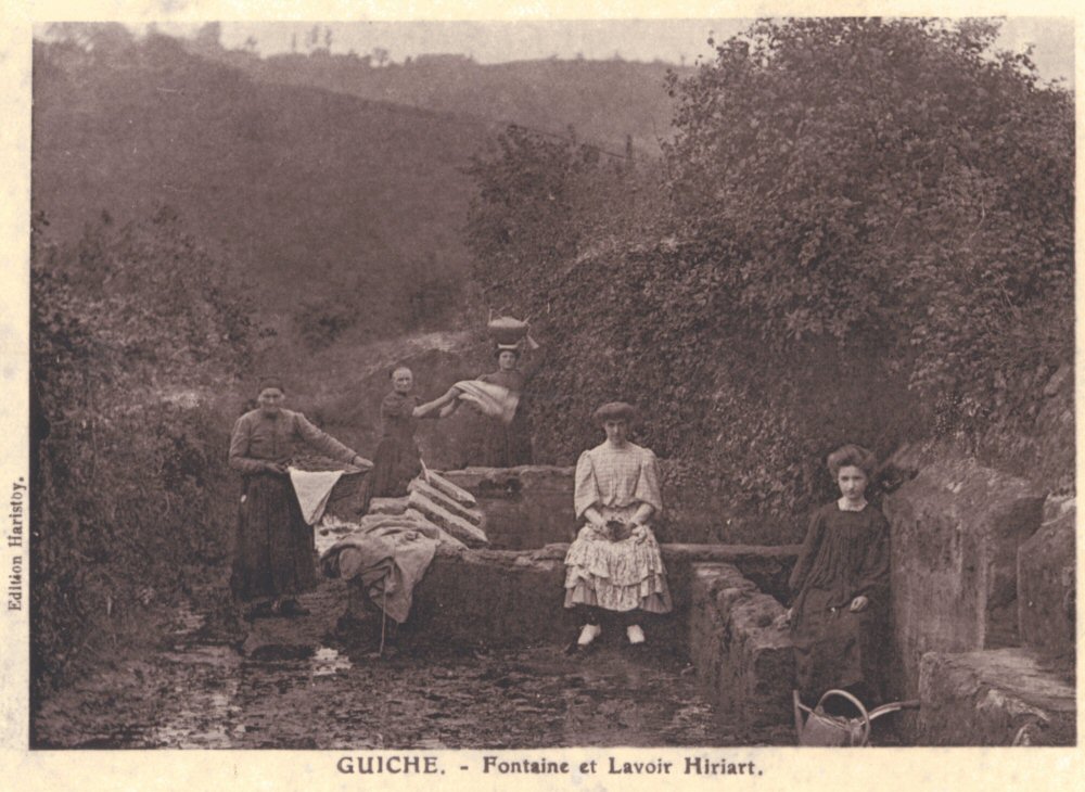 Cette carte postale du début du XXᵉ siècle, édité par la famille Haristoy, propriétaire de la maison Hiriart est une composition où figurent en avant plan les jeunes filles de la maison ainsi que les lavandières.